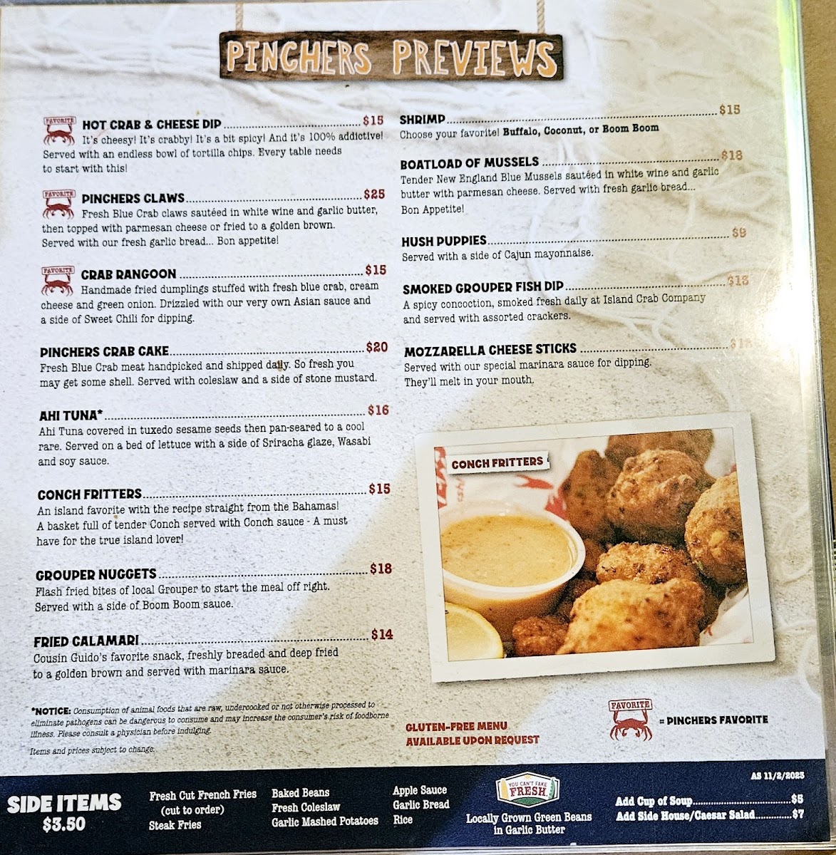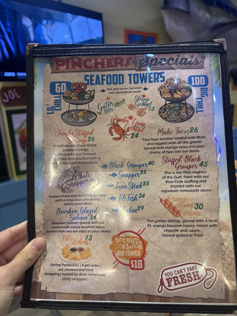 Pinchers offers a relaxed and approachable menu focused on fresh seafood and comforting flavors that suit a variety of occasions, from casual lunches to laid-back dinners. The menu features everything from signature shrimp dishes and blue crab clusters to classic sandwiches like the Gulf Grouper and hearty sides such as garlic mashed potatoes and fresh-cut fries.